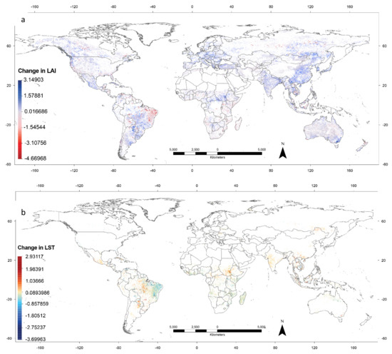 (a) Difference between mean LAI of 2003–2010 and 2011–2018, and (b) mean LST of 2003–2010 and 2011–2018 in kelvin. Insignificant changes (p > 0.05) have been masked out.