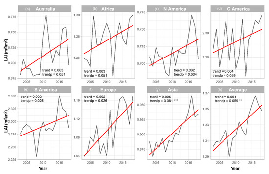 Trend of continental LAI from 2003 to 2018. ***: p < 0.001, **: p < 0.01.