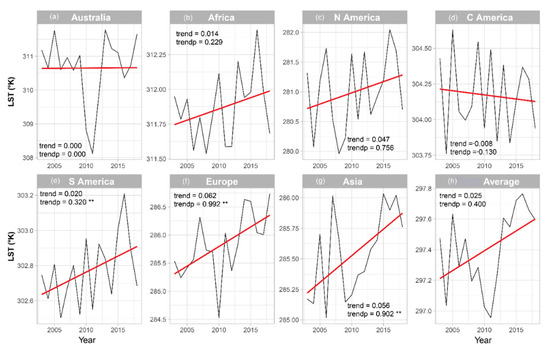 The temporal trends in LST for different continents can be seen in Figure 4a–h. Both trend and trendp were estimated for each continent. The changing trends of LST varied by continent. For example, in Australia, no trend was observed, however there was a very sharp drop in LST in 2010. In Africa (trendp = 0.229) and North America (trendp = 0.756), an increasing trend was observed. In contrast, a decreasing trend of LST was observed for Central America. Although the increasing trend of LST was greater in South America (trendp = 0.320) compared to Africa, Europe (trendp = 0.992) and Asia (trendp = 0.902) had the most significant increase in LST over the study period.