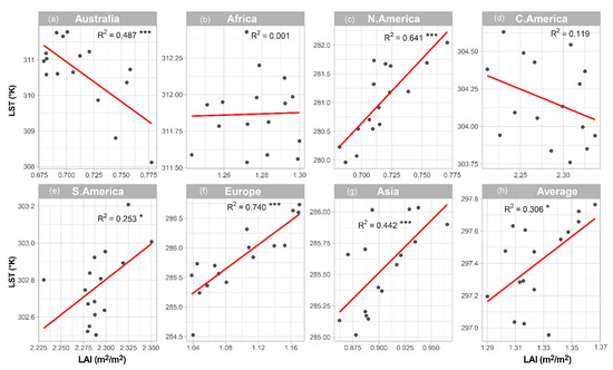 Continental relationship between LAI and LST from 2003 to 2018. ***: p < 0.001, *: p < 0.05.