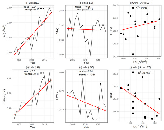 (a–f): Trend of LAI and LST in China and India, and relationship between them, from 2003 to 2018. ***: p < 0.001, *: p < 0.05.