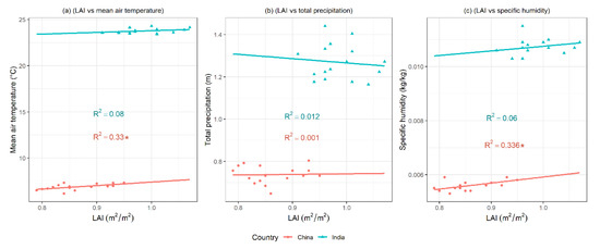- A weak positive relationship between LAI and mean air temperature and specific humidity was observed in China. However, no relationship was found between LAI and selected climatic variables in India.