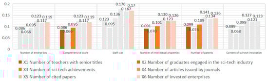 - Number of invested enterprises (X6): This indicator, corresponding to all three types of HEIs, has a significant positive influence on the number of surrounding enterprises as well as on the comprehensive scores, staff size, number of intellectual properties and number of patents of STEs at the 0.01 significance level. This indicator of Type I and Type II HEIs has significantly positive correlations with the content of sci-tech innovation; however, the indicator of Type III HEIs shows no significant correlation.