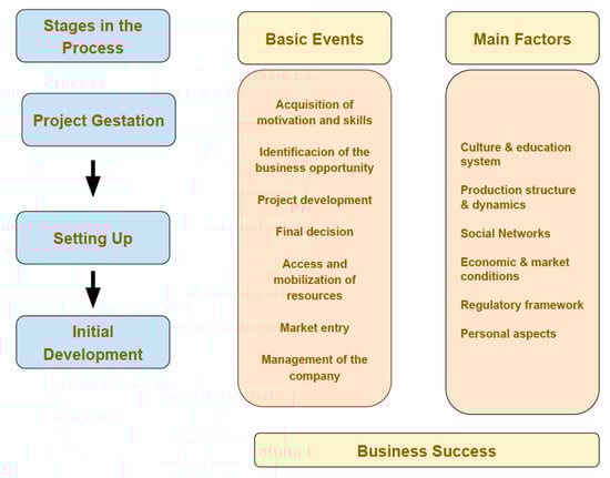 Following the above, Kantis et al. [27] defined three stages in the company creation process: The project gestation, the set-up, and the initial development of the firm. In each of these phases, certain main factors that affect the critical events of the said phases can be identified, all of which are shown in Figure 1.
