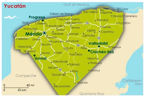 Geographical location of the State of Yucatan (Mexico) and main municipalities. Source: https://www.mapade.org/yucatan.html.