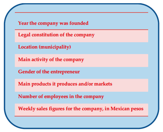 | No. | Year Company Was Created | Legal Constitution | Municipality | Informant’s Business Activity | Gender of the Entrepreneur/Informant | Main Products it Produces and/or Markets | No. Employees (Including the Informant) | Weekly Sales (Mexican $) |