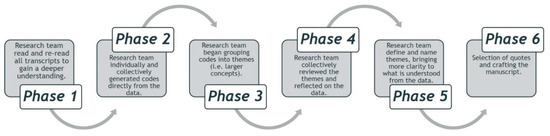 Guided by Braun and Clarke [56], this study followed a thematic analysis approach. Thematic analysis is a method for identifying, analyzing, and reporting patterns (themes) within data. It minimally organizes and describes the data set in rich detail. However, it goes further than this and interprets various aspects of the research topic [57]. This process follows an inductive approach to coding and development of themes, meaning that the themes identified are strongly linked to the data themselves [58]. This approach involved reducing the empirical material into categories guided by the participants’ narratives without losing sight of the research aims, a process which allowed for the identification of emergent themes [59]. Thematic analysis follows a six-step approach as described by Braun and Clarke, the process followed by the research team is outlined in Figure 1 [56]. Phase one begins with familiarizing yourself with the data; in this phase, all audio recording of focus groups and interviews were transcribed, and each author read and re-read the transcripts. Phase two involved the authors generating initial codes using NVivo 12; the ideas captured in the focus group discussions were coded in an iterative process. During the third phase the research team began discussing and searching for themes by re-focusing the analysis at the broader level of themes, rather than codes. This involved sorting the different codes into potential themes and collating all the relevant coded data extracts within the identified themes. Phase four allowed for the authors to review themes, remove, and combine as necessary, and reflect on the inductive process by considering why the data were within the theme. Phase five allowed the research team to define and name themes, while keeping the perspective that themes do not have to be what is talked about the most, but rather should be a reflection of what is important and interesting in relation to the research questions and the data themselves. Phase six of the thematic analysis process focused on crafting this manuscript and selecting quotes to support the themes. After triangulating our respective individual interpretations from this process, further joint discussion facilitated the development of the interpretations that follow.
