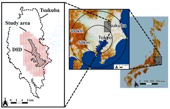 Figure 1 shows the coverage of the study site. The Tsukuba Science City is the central urban area in Tsukuba City, Ibaraki Prefecture, and the core is composed of a Densely Inhabited District (DID) which is a classification on the statistical survey in Japan []. Since there are no clear boundaries in the Tsukuba Science City, the study site is defined based on the Fourth Standard Grids (FSGs) of Japan, a national grid system with an approximately 500 m grid pattern (22.5 s in longitude, 15 s in latitude) []. We selected FSGs located within 3 km of the DID surveyed in 2015. Note that the DID area has not changed significantly since 1990. The area that we analyzed is about 10,200 ha with 408 grids.