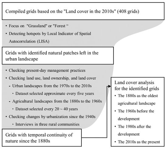 First, we highlighted the land cover in the 2010s and investigated the patches of natural environments left in the urbanized area. Second, we investigated 130-year temporal continuities of the patches (Figure 2). For the spatio-temporal analysis, we analyzed land dynamics from the nine time periods (1880s–2010s) using sets of aerial photographs and topographic maps created by the Geospatial Information Authority (GSI) of Japan [], the national surveys of the natural environment vegetation map [,], and the Land Use and Land Cover Map provided by the Japan Aerospace Exploration Agency (JAXA) [] (Table S1).