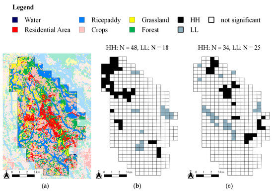 (a) Land cover distribution and significant high–high (HH) and low–low (LL) grids in (b) Grassland and (c) Forest in the 2010s. In (a), translucent were not included in our study site. HH means statistically significant high–high grid. LL means statistically significant low–low grid. In this study, there is no statistically significant low–high or high–low grid. A p-value less than 0.05 was considered statistically significant.