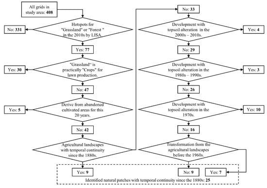 We found that natural patches, located on 25 HH grids in the 2010s, have had temporal continuity of grassland or forest land since the 1880s (Table 2). Figure 4 shows the flow chart that identified these grids.