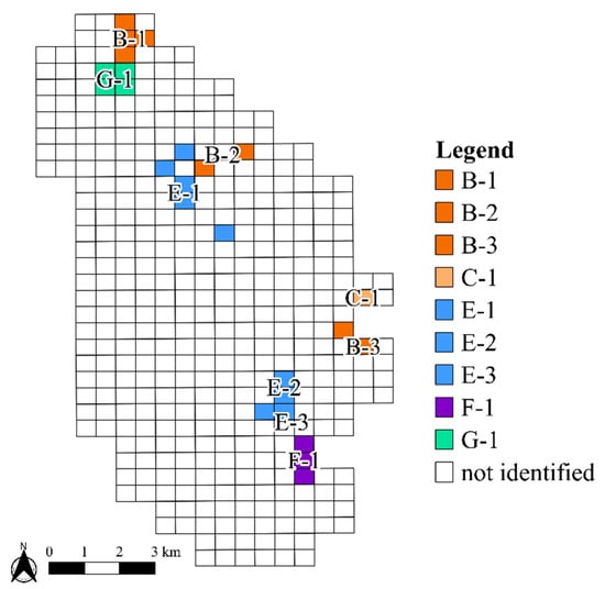 Four grids were extracted from the G category, which are the planned sites for development. G-1 grids have existed as proposed sites for development since the 1970s and are denoted as HH grids for “Forest” including two “Grassland”. In addition, three F-1 grids overlapped with the site of the Kasumigaura International Golf Course. All F-1 grids consisted of HH grids for “Grassland”.