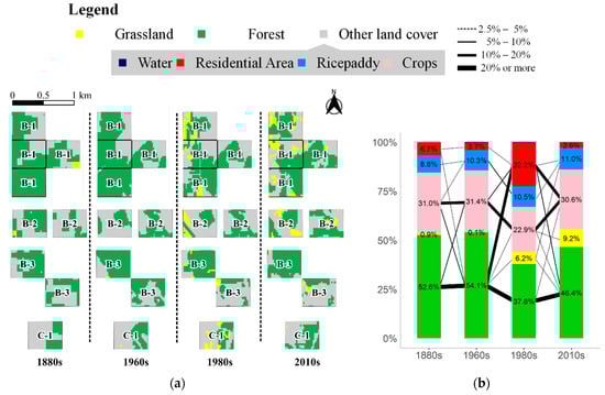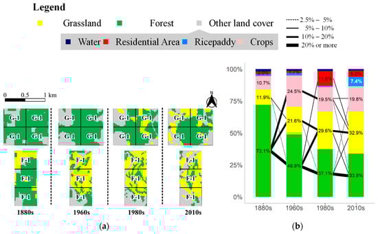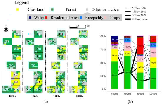 The time series land cover map and changes in land cover types in the grids that belong to three rural communities. (a) shows the land cover map between the 1880s and 2010s focused on the natural environments (Forest and Grassland). (b) shows the changes in land cover types between the 1880s and 2010s. The value in each bar represents the percentage (%) of each land cover type. The connecting line between two bars indicates the change in land cover type through the periods. The thickness of the line corresponds to the proportion of the changed area with respect to the grids shown in (a). The line was omitted if the proportion is less than 2.5%.