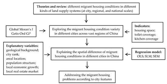 The following sections will introduce (a) the data sources and their advantages, (b) the method used to analyze the spatial heterogeneity and the agglomeration area for the three housing condition indicators, and (c) the regression models used to explore the influencing factors. The research design is shown in Figure 1.