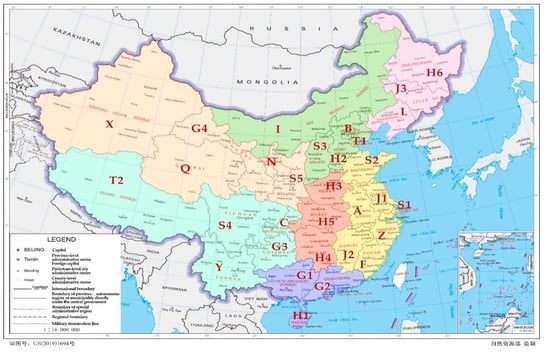 It should be noted that, apart from Hong Kong, Macao, and Taiwan, China can be divided into seven regions. In Figure 2, different colors differentiate the seven regions: (1) Northeast China in the pink color including the provinces of Heilongjiang (H6), Jilin (J3), and Liaoning (L); (2) Northwest China in the Earth-yellow color including Ningxia (N), Xinjiang (X), Qinghai (Q), Shaanxi (S5), and Gansu (G4); (3) North China in the light-green color including Beijing (B), Tianjin (T1), Hebei (H2), Shanxi (S3), and Inner Mongolia (I); (4) Central China in the orange color including Henan (H3), Hunan (H4), and Hubei (H5); (5) East China in the yellow color including Shanghai (S1), Shandong (S2), Jiangsu (J1), Jiangxi (J2), Anhui (A), Zhejiang (Z), and Fujian (F); (6) South China in the purple color including Guangdong (G2), Guangxi (G1), and Hainan (H1); (7) Southwest China in the sky-blue color including Sichuan (S4), Yunnan (Y), Guizhou (G3), Tibet (T2), and Chongqing (C).