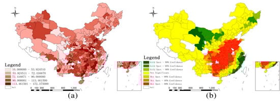 The spatiality of the household housing space of inter-provincial migrants in urban China: (a) household housing space (unit: m2); (b) hotspot analysis of household housing space. (Data source: 1% population sampling survey conducted in 2015 by the National Bureau of Statistics of China.).