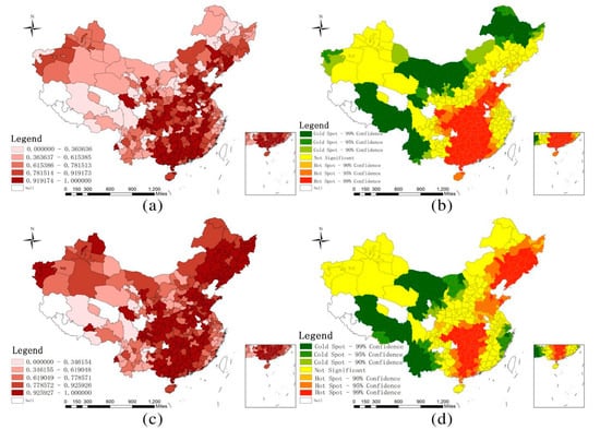 The spatiality of the basic amenity coverage of inter-provincial migrants in urban China: (a) percentage of private toilet coverage; (b) hotspot analysis of the percentage of private toilet coverage; (c) percentage of private kitchen coverage; (d) hotspot analysis of the percentage of private kitchen coverage. (Data source: 1% population sampling survey conducted in 2015 by the National Bureau of Statistics of China.).