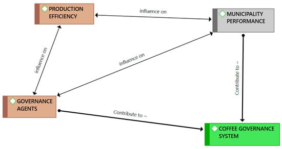 In this framework (Figure 1), the governance agents (GA) and the idea of production efficiency (PE) are manifested in those coffee-growing municipalities where producers are more motivated by better farm yields and income, [55,60,61]. During the process, they acquire greater soft skills of managerial and cooperative leadership, increasing their bargaining power and access to new markets with a range of actors at the local, national, and international scale [10].
