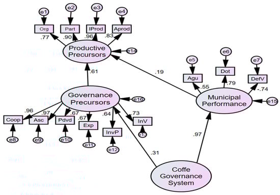 At this point, it is worth remembering a great virtue of the SEM/AMOS analysis in terms of revealing, by means of the variance error, the measure of the underlying variables (ovals). These variables, according to statistical theory, would be endogenous if in the model they appear depending on other variables, such as the case of PE, MP, and GAs. The variable coffee governance system (lower oval) would be exogenous since the effect of endogenous variables is directed towards it [45], thus explaining how this endogenous model contributes to determining this governance system associated with the coffee territory. The values that appear between the endogenous and exogenous variables represent the error of the variance. It should be interpreted similarly to the respective coefficient calculated in a correlation, being a measure of how much they influence each other. This value also has a scale from 0 to 1.