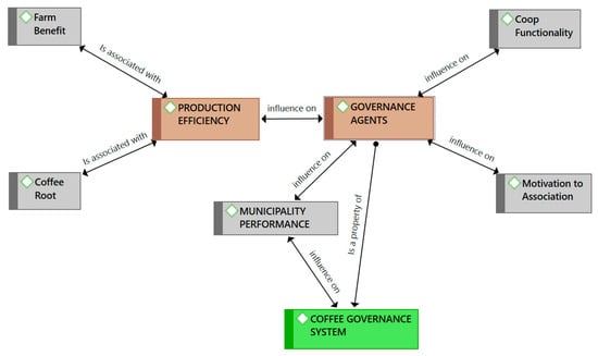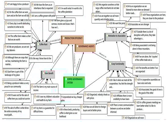 Semi-structured interviews were used focused on the same four constructs that were subjected to analysis in the quantitative part, trying to collect the perceptions and positions of the interviewee regarding these issues. Thus, the richness of the daily experience of the interviewees can be better captured and triangulated with the quantitative part, which improves the validity and reliability of the study findings [76,77]. The flexible modality of the interview allowed us to deepen and detail, in the opinion of the producers, those key points that determine the TG. In the interviews, convergence was detected on issues such as the importance of being rooted in the territory, what things motivate associating with others, the intrinsic value of being a coffee grower, and trust in the institution. All the information collected was organized into seven categories fed by a selective codification of the different concepts that revolve around the idea of governance since the grounded theory recognizes as theoretical foundations the collective and similar thinking of those who share the territory [78]. This part was guided by ATLAS.ti software version 8.0 (see Figure 4 and Figure 5), which organizes and synthesizes the information collected through semantic networks (diagrams) that highlight the living expression of the informant, providing a very useful didactic illustration to contrast with the quantitative part [74].