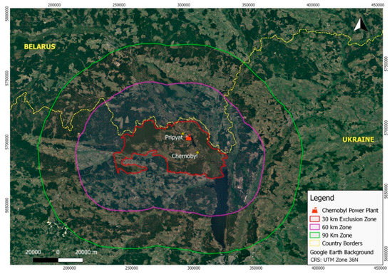 While all previously mentioned works focus on field experiments and collection of in situ data, either for human or animal and plant impact studies, there is a great potential of remotely sensed information to contribute to an environmental impact assessment. Currently, there are numerous studies being published on environmental monitoring and impact assessment using mainly satellite derived remotely sensed data. Environmental remotely sensed information has been available to scientists for almost fifty years, e.g., the Landsat missions, or the Terra and Aqua satellites from the NASA’s Earth Observing System Data and Information System (EOSDIS), among many others. It is, however, only after the advances of IT and especially the evolution of the internet, when scientists achieved easy access to a long enough time series of environmental data at a global scale, that scientists have been able to perform regional and global assessments concerning climate change [16,17,18,19], hydrology [20,21,22,23,24], vegetation productivity and changes [25,26,27,28,29]. The aim of the present work is to identify whether vegetation productivity has been affected by the catastrophic failure of Chernobyl Power Plant on the 26th of April 1986, i.e., exactly 34 years before the present work. Vegetation productivity was assessed using MODIS remotely sensed normalized difference vegetation index (NDVI) data from 2000 to 2020, in three distinct zones in the Chernobyl Power Plant area, i.e., the 30 km Exclusion Zone and two surrounding zones, i.e., the 30 to 60 km zone (hereafter 60 km zone) and the 60 to 90 km zone (hereafter 90 km zone). The magnitude and direction of vegetation productivity (increasing or decreasing trends) were computed applying seasonal trend analysis at the pixel level and with spatially averaged time series of NDVI values, in various land cover types in each one of the three zones. Results were evaluated considering also the dominant land cover changes that took place in each zone.