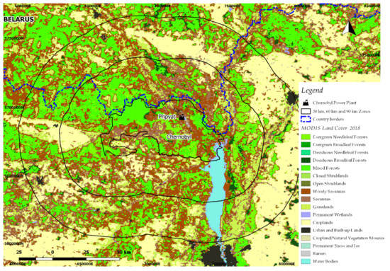 The Chernobyl area is located in the north part of Ukraine, bordering Belarus. The region is a rural area, covered mostly by woodlands and marshlands. Major urban centers used to be the cities of Chernobyl and Pripyat which have been uninhabited for the last 35 years. Chernobyl is widely known for the nuclear accident that occurred on 26 April 1986. The disaster resulted in the evacuation of 116,000 individuals from the area. The wildlife that remained in the abandoned area was further affected by exposure to very high doses of radioactivity immediately following the accident. Studies related to the long-term effects of radiation on mammal abundance in the Chernobyl area did not support evidence of a negative influence of radiation [10], whereas the need for further research on the ecological consequences of radiation on specific vertebrate and invertebrate species is highlighted in relevant studies [3]. Many of the people who evacuated the Chernobyl area moved to a new city, 50 km east of Chernobyl, namely Slavutych. The Chernobyl accident released radioactive isotopes into the atmosphere, polluting a major portion of land in Europe [3]. Immediately after the accident, a 30 km radius area around Chernobyl Nuclear Power Plant was established by the Soviet Union, known as the Chernobyl Exclusion Zone (Figure 1). The study area is the bounding region of approximately 32,000 km2 of the Chernobyl Power Plant. It comprises the 30 km Exclusion Zone, and two additional bounding zones, i.e., the 60 km zone, formed as a region covering the area from 30 to 60 km around the Chernobyl site, and the 90 km zone covering the area from 60 to 90 km from Chernobyl (Figure 1). Land cover types based on the MODIS 2018 MCD12Q1 product [32] (MODIS/Terra+Aqua Land Cover Type Yearly L3 Global 500 m SIN Grid V006 DOI: 10.5067/MODIS/MCD12Q1.006) in the three examined zones can be seen in Figure 2. Land cover classes are defined according to the International Geosphere-Biosphere Program (IGBP) classification scheme. Table 1 provides information on the area occupied by the individual land cover types in each zone. Vegetation dynamics were determined in all three individual zones in the different land cover types and the results for the 30 km Exclusion Zone (abandoned area where no human activities take place) were compared against the 60 and 90 km zones (zones where human activities did not cease).
