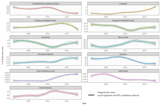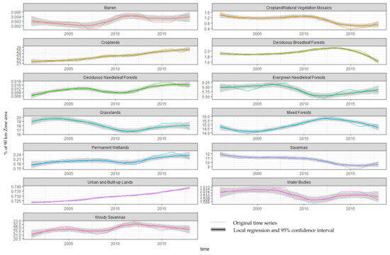 Land cover changes in the three examined zones were assessed using the MODIS MCD12Q1 land cover product [50], and the dominant changes in all three zones were highlighted. MCD12Q1 comprises 5 legacy classification schemes, among which the IGBP classification provides the most categories, classifying Earth’s surface into 17 land cover types (Table 1). MCD12Q1 is provided globally at an annual time step from 2001 to 2018, with 500 m spatial resolution. The latest collection, i.e., Collection 6 of the MCD12Q1, was used in the present work.