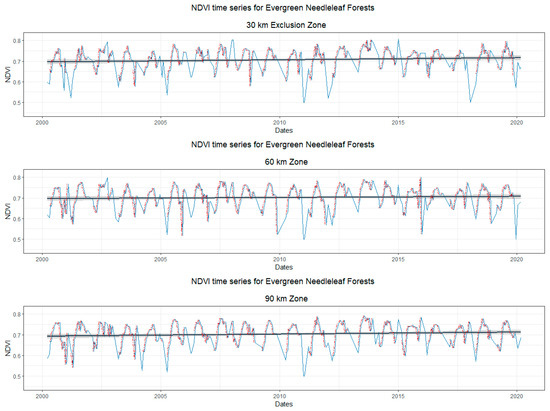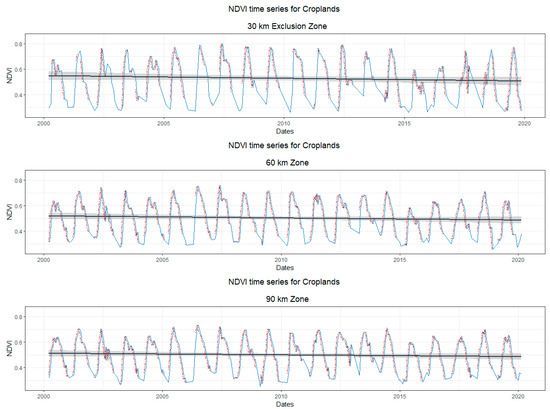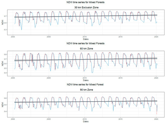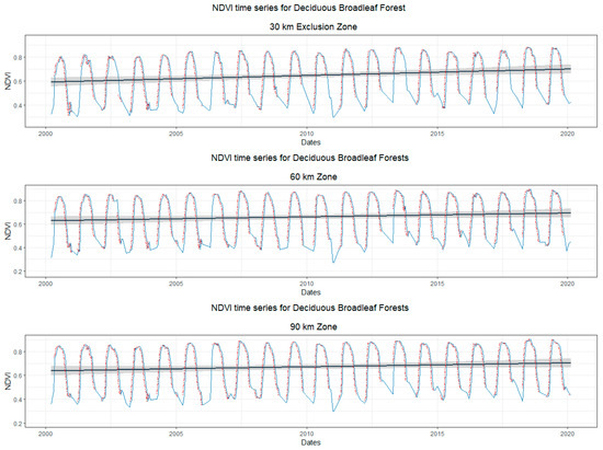 Input data were continuous MODIS NDVI images, at a 16-day time step for the period 2000 to 2020, i.e., the complete time series of MODIS NDVI products, after applying a filter based on the 250 m 16-day VI quality layer, to exclude problematic pixels as described in Section 2.2. It is true that the year 2000 is 14 years after the Chernobyl disaster happened, so the analysis presented herein does not represent the conditions immediately after the accident, which is beyond the scope of the present work. The methodology could have been applied blending multisource NDVI data, e.g., the GIMMS NDVI dataset, or the NDVI from Landsat satellites. However, the different products offer different spatial resolution and time coverage, and although data blending techniques have been developed [53], they all introduce errors to some extent. Therefore, in the present work, for keeping data consistency, one data source was used, even though it cannot capture the full progress of the phenomenon. However, the goal is to detect differences in vegetation dynamics and observe whether vegetation has recovered in the same manner in the 30 km Exclusion Zone and the two surrounding zones, i.e., the 60 and 90 km zones. This can be safely accomplished using the 20-year dataset of MODIS NDVI products.