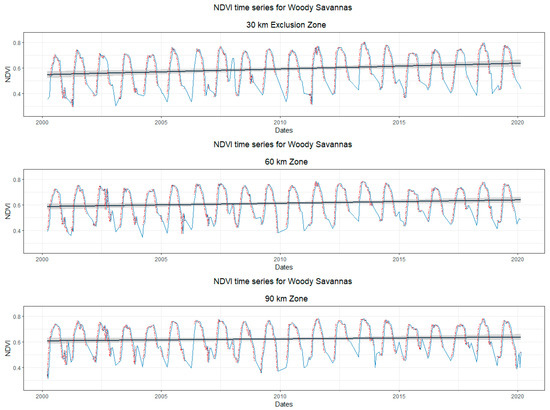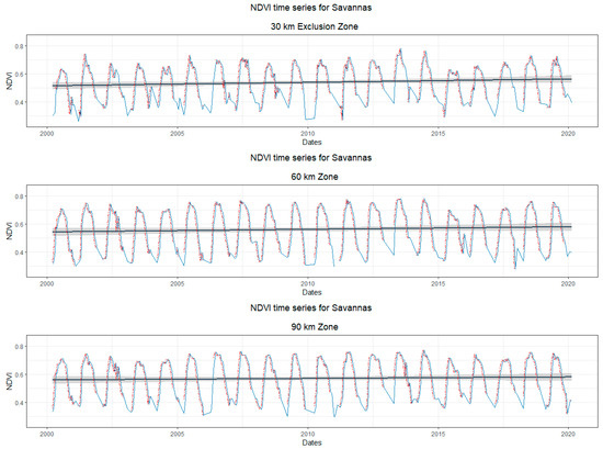 Combining analysis of NDVI time series in various land cover types with the results from the evolution of land cover changes in the three zones, one may conclude that the land cover categories covering most of the area in the 30 km Exclusion Zone, i.e., Woody Savannas and Mixed Forests, both gain areas, expanding at the expense of Grasslands decline, and they also demonstrate substantial greening trends. The same situation can be observed for the 60 km zone, where Woody Savannas and Mixed Forests are the dominant land cover types, both expanding and demonstrating increasing NDVI trends.