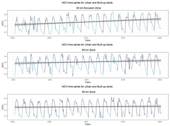 Spatially averaged NDVI time series in Urban and Built-up Lands. The red dotted line corresponds to observed values, the blue line is for modeled time series and the black line is the linear trend, whereas grey zones correspond to a 95% confidence interval.