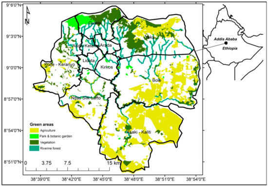 This study took place in Addis Ababa, the capital and largest city of Ethiopia. The city is located at 8°45′ and 9°49′ latitude North and 38°39′ and 38°54′ longitude East (Figure 1), with a total land area of 520 km2 and population of around 3.238 million [63]. Addis Ababa is a chartered city with three tier administrations: city, sub-city and woreda (district). Topography in the city is very variable, with mountainous and undulating terrain and a deep gorge in the north and west, and low-lying and flat terrain in the south and east. Altitude ranges from 2100 m to 3100 m above sea level [64]. The mean annual precipitation is 1100 mm, mostly falling from June to August, and the mean monthly temperature varies between 14.8 °C and 17.9 °C [64].