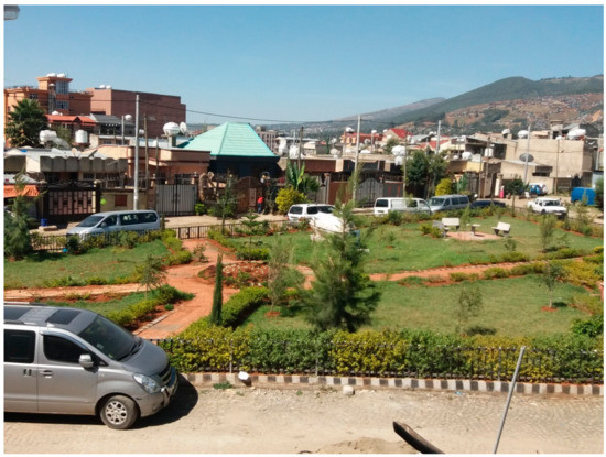 Neighborhood parks (Figure 2), the focus of this study, are primarily developed for recreation and social interaction by the community in the neighborhood. They are planned according to international best practice guidelines that consider that no person should live more than 300 m from their nearest area of green space [68,69,70]. In the formally planned residential area of Addis Ababa, especially outside the Central Business District, the Addis Ababa city administration provides land for the development of NPs for free. One such park is usually intended for use by 50–70 households. Residents typically establish a “green space committee” whose responsibility it is to coordinate the financing, development, maintenance and use of NPs.