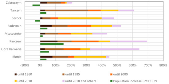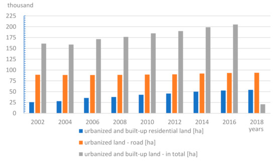 - Comparative analysis of the increases in the surface of urbanized areas based on own calculations (Stage I.a) correlated with the changes in population size (increase/decrease) in the studied years. The authors’ own comparative analyses, comparing the existing urbanized areas with the areas designated for development in the studies of conditions and directions of spatial development of municipalities.