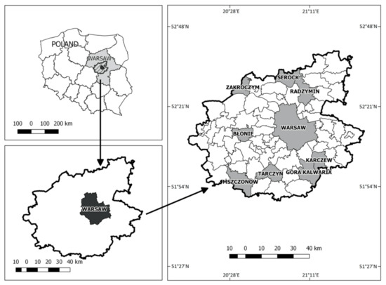 - Degórska, B. Spatial growth of urbanised land within the Warsaw Metropolitan Area in the first decade of the 21st century. Geogr. Pol. 2012, 85, 77–95. [Google Scholar] [CrossRef]