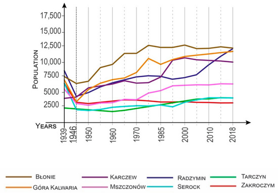 - Analysis and interpretation of archival cartographic documents and aerial photographs of the studied cities in the years 1939, 1946, 1961, 1978, 1992, 2018, based on the authors’ own calculations of the surface of urbanized areas in specific periods, which were made using the ArcGIS ESRI and AutoCad software.