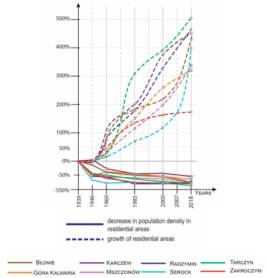 - From the mid-1990s to the present day, the process of building new housing units on agricultural areas, the so-called strip-of-farmland-based urban planning, could be observed. Comb-like layouts of cities, unrelated to the historic center and located at a distance of approx. 2–4 km, are delineated. The process of building residential development projects right near the city borders, unrelated to the historic center, could also be observed.