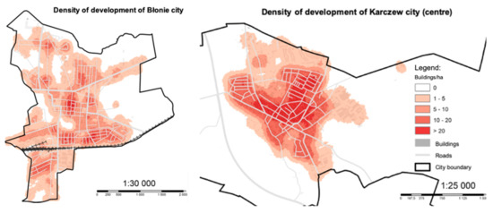 - Determination of the development intensity for selected, characteristic plots developed in different in the studied periods of the cities’ development, plot area, the total area of development, and the number of floors. To this end, the BDOT10k topographical database, Kernel Density Estimation and the geoportal.gov.pl site were used.