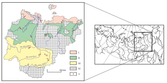 Map of the explored permafrost landscapes of Yakutia: I—tundra, II—northern taiga, III—middle taiga, IV—mountain and high plateau areas, V—meteorological station (1—Saskylakh, 2—Tiksi, 3—Chokurdakh, 4—Olenek, 5—Zhigansk, 6—Verkhoyansk, 7—Srednekolymsk, 8—Vilyuisk, 9—Yakutsk, 10—Churapcha, 11—Ust-Maya).