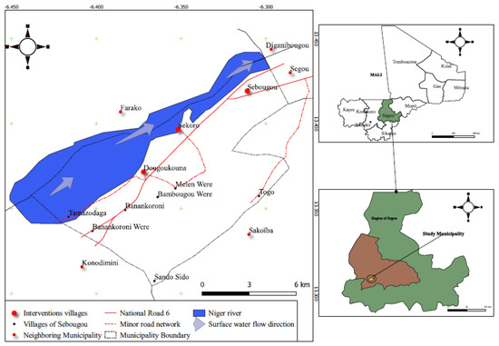 Sebougou is a municipality in the region of Ségou. Ségou is the third-largest city in Mali, with a population of approximately 200,000. Sebougou was officially created by law No. 96-059 of 4 November 1996, establishing the municipalities. The rural municipality of Sebougou is bounded to the east, west, north, and the south by the urban commune of Ségou, the rural municipality of Konodimini, the rural municipality of Farako, and the rural municipality of Sakoiba, respectively (Figure 1). Youth populations generally dominate the demography of the region of Ségou. In 2015, of a total population of 2.03 million, the 0–15 age group accounted for 48.5%, 35.3% were aged 15–39 years, 11.6% were in the 40–59 age group, and those 60+ accounted for 4.7% [38]. The main economic activity is agriculture, which faces climatic hazards.
