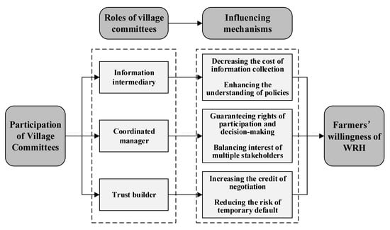 WRH refers to the transfer of homestead use right to collective economic organizations under farmers’ voluntary application with compensation from the government. After transferring, farmers can either live in concentrated settlements nearby or directly migrate to cities. However, house-losing farmers tend to resettle in concentrated residential zones rather than migrating to cities, given that most farmers can hardly afford urban housing and have to earn their lives by engaging in agricultural activities []. In China, WRH is mostly dominated by local governments at the county/township-levels. These local authorities tend to give grassroots (village committees) greater autonomy regarding the withdrawal procedure, compensation standards and resettlement planning, and introduce enterprises to implement the project of land remediation. Within the context of administrative decentralization and community empowerment, the leading role of village committees in rural governance is increasingly recognized by both scholars and policymakers [,,]. The participation of village committees is essential for WRH in at least the following three aspects (Figure 1, drawn by authors).