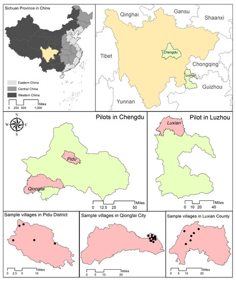 As illustrated in Figure 2, a total of 24 administrative villages in three counties/districts (i.e., Luxian, Pidu, Qionglai) in Sichuan Province were selected as samples. The primary reason to take these regions as examples is that these areas have carried out pilot projects of rural homesteads reform in China on one hand. On the other hand, these pilot regions are at different levels of economic development and topographical characteristics, which might be helpful in increasing the representativeness of samples To be specific, Luxian County is one of the 15 national level pilots on rural homestead acquisition and approval, paid use of homesteads, and mortgage loans []. Situated in Chengdu, the provincial capital of Sichuan, Pidu District and Qionglai City are exploring rural homesteads exit mechanisms within the context of urban–rural integration, comprehensive land remediation, high-standard farmland conservation, new countryside building, and rural vitalization []. Topographically, the sample villages are located in the southern mountain area (Luxian and Qionglai) and Chengdu plain (Pidu), respectively. Additionally, the level of economic development in the three regions varies. Pidu is an economically developed region with its per capita GDP over RMB 73,000 in 2019; Luxian is relatively underdeveloped with a per capita GDP of RMB 43,400 and the lowest urbanization rate; Qionglai is in the middle of its two counterparts with a per capita GDP of RMB 53,413.