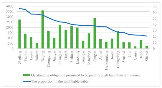 Essentially, land and land-related revenue are deeply involved, from the establishment of local financialization platforms and asset injection, guarantees, and mortgages in borrowing and issuing bonds, to the repayment of principle and interest in the future. Extensive empirical research has verified the guarantee function of land in the issuance of urban investment bonds and its mortgage function in obtaining loans from banks. For example, the research of Shu, Xie, Jiang, and Chen (2018) [16] and Zhong, Chen, and Huang (2016) [34] indicates that the greater the price of urban land transfer or revenue, the higher the possibility of issuing urban investment bonds. The scale of the bonds issued will also accordingly be larger. This is because land use rights are often used as the guarantee, and land transfer revenues are promised to pay back debt during the issuance of urban investment bonds. Zhang, Nian, and Liu (2018) [23] found that there was a significant positive relationship between land transfer revenue and urban investment bonds. According to the debt auditing report by the National Audit Office from 2011 to 2013, as of the end of 2010 the outstanding obligation that local governments promised to pay through land transfer revenue stood at 2.547 trillion yuan, amounting to 38% of the total liable debts. This figure grew to 3.49 trillion yuan at the end of 2012—an increase of nearly 37% within two years. The outstanding obligation promised to be paid through land transfer revenue is shown in Figure 1. We can find that, by the end of 2012, the proportion of outstanding obligation promised to be paid through land transfer revenue in Zhejiang Province, Tianjin Municipality, and Beijing Municipality exceeds 60%.