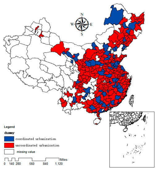 Figure 2 represent the lagged-behind level of population urbanization relative to the land urbanization of Chinese cities in 2015. Coordinated urbanization represents that the land urbanization growth rate relative to the population urbanization growth rate is within an appropriate range, and the uncoordinated development of population urbanization and land urbanization does not exist. Uncoordinated urbanization represents that the population urbanization growth rate severely lags behind the land urbanization growth rate, and the uncoordinated development of population urbanization and land urbanization does exist. We find that uncoordinated urbanization exists in most cities in China.