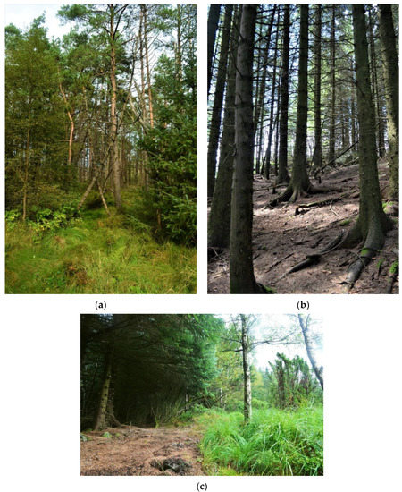 It is quite clear that the biodiversity is severely restricted due to limited light in such a dense Sitka forest. This confirms the warnings issued by Saure et al. [63] who analysed loss of biodiversity under single Sitka trees invading Calluna dominated heathlands. The reduced biodiversity in dense Sitka forests, as seen in Figure 6b, is indeed quite extreme. Saure et al. [63] recommend controlling spread of Sitka, and Øyen et al. [64] advise collection of data to show the effect on biodiversity in Sitka forest over a longer period.