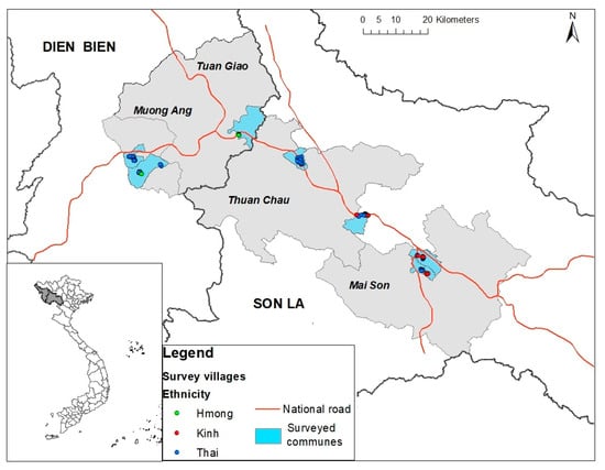 Map of the study sites and the communes surveyed in the Son La and Dien Bien provinces of northwest Vietnam.