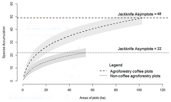 Species accumulations and first order Jackknife asymptotes by area from coffee agroforestry plots and non-coffee plots (orchards, annual crops, timbers).