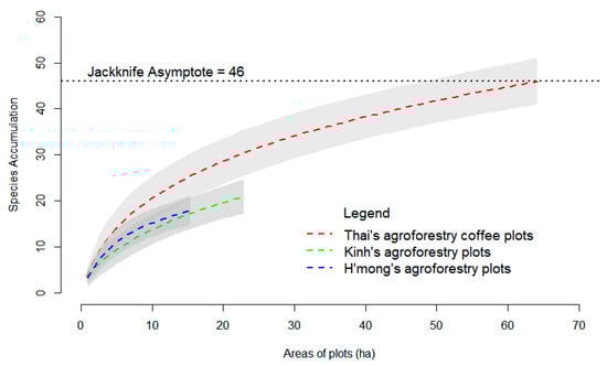 Species accumulations and first order Jackknife asymptotes by area from all coffee agroforestry plots of Thai, H’mong and Kinh ethnic groups.