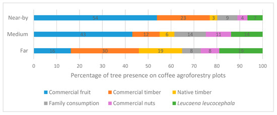 When farmers selected tree species to be intercropped with coffee in agroforestry plots, the primary factor that influenced their selection was their commercial value, i.e., their value for the provision of fruits or timbers that could be sold. There was a number of variables related to this factor including market price, proximity to market (indicated in the present study, by proximity to a main road because farmers usually sold fruits on the side of the main road). Among the three ethnic groups, the H’mong were generally at the furthest distance from the road compared with the other two groups. The Kinh people had good road networks because they live in the lower altitudes. The proximity to the road was identified as a critical factor for determining tree species selection by farmers.Fifty-two of the sampled farms were in communes near the main road (0–2 km), 54 farms were at medium distance to the main road (2–5 km) and 18 farms were were far from the main road (5–7 km) (Figure 4). High-value commercial species (fruits, timbers and nuts) were commonly integrated with coffee in the close and medium distance farms (accounting for 81 and 66% of the total trees species, respectively). Commercial species were less commonly (54%) far from the main road. In these farms, more native timbers were intercropped in the coffee plots. The leguminous species, L. leucocephala, was more common in the farms far from the main road.