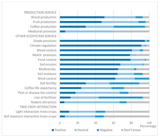 Farmers had in-depth knowledge of the benefits trees provided to coffee. Most of them were aware of observable ecosystem services such as reducing soil erosion, improving soil fertility, enhancing biodiversity, preventing damage from wind and frost, and providing shade and mulch.