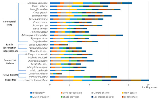 Among 48 tree species encountered in coffee plots, only 25 species were intercropped in more than 2% of coffee farms. These species were selected for tree pairwise ranking exercises. Accumulated values for each species are shown in Figure 6. The leguminous shade tree species (L. leucocephala) was the highest valued species based on its services provided to coffee. Dimocarpus longan was the second highest valued species but was the most common species intercropped across coffee farms, followed by mango due to the high commercial value of their fruit. Timber trees were not preferred as farmers stated that timber trees compete for nutrients and water with coffee. Details on the ranking for each tree service are presented in Appendix B.